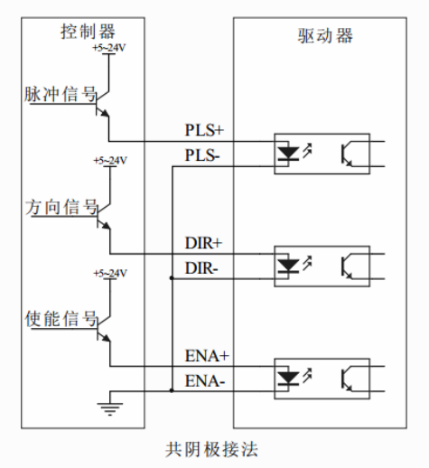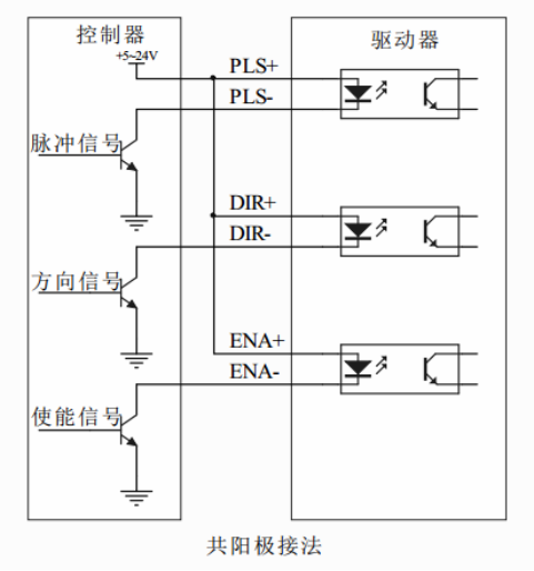 PLS+ | 脉冲控制信号:+5V-+24V均可驱动,上升沿有效,每当脉冲由高变低时,电机走一微步。为了可靠响应脉冲信号,脉冲宽度应大于2μs。 |
