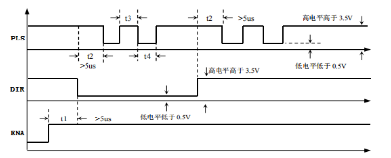 1)t1:ENA(使能信号)应提前DIR至少5ms,确定为高。一般情况下建议ENA+和ENA-悬空即可。