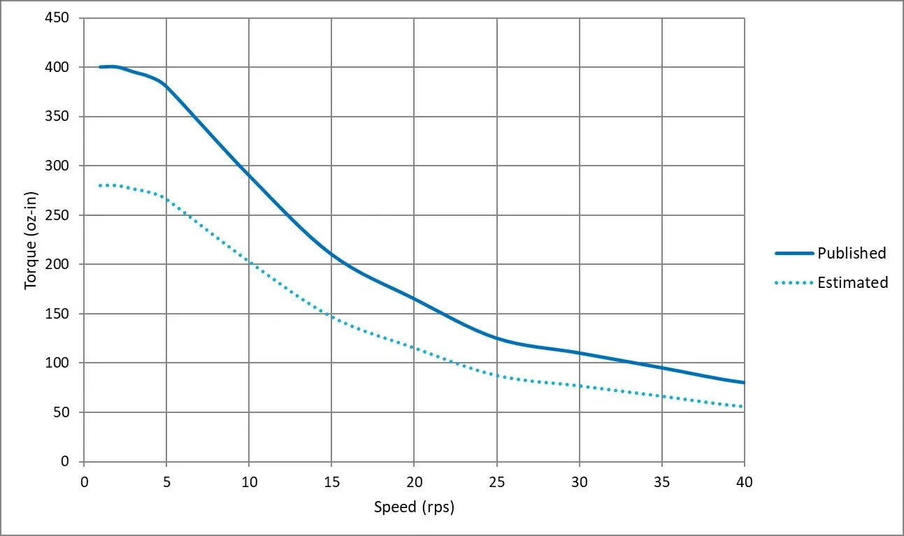 步进电机的典型速度-扭矩曲线。在制造商公布的数据中,仅显示了实线,表示失速扭矩与速度的关系,用户必须估算可用的扭矩范围,如虚线所示。