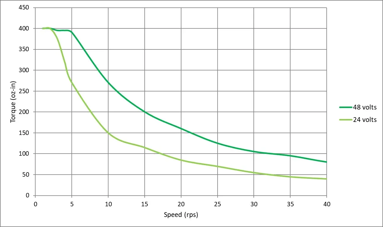 同一步进电机和驱动器组合的两条速度-扭矩曲线,只是电源电压不同。深绿色线显示48V电源的失速扭矩,浅绿色线显示24V电源的失速扭矩,12V电源会刺激更低的曲线。