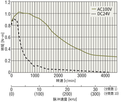 步进电动机通过驱动器施加直流电压来驱动电动机。本公司的DC24V输入组合产品是将DC24V直接施加于电动机,而AC100V、AC200V输入产品则是将电压整流成约DC140V电压后施加于电动机。(部分产品除外。)这种施加到电动机上的电压差异会体现在高速域的转矩特性上。这是因为,电动机线圈中流动的电流的上升速度随着施加电压的升高而加快,因此在高速域也能流动额定电流。也就是说,AC输入产品在低速域到高速域的全域都具有良好的转矩特性,可以获得大的速度比。因此,在使用时,我们首先推荐能够应对多种使用条件的AC输入产品。