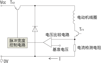 通过检测电阻取出电动机线圈中流动的电流作为电压,并与基准电压比较。当检测电阻的电压低于基准电压(未达到额定电流)时,继续使开关晶体管Tr2保持ON状态;当检测电阻的电压高于基准电压(超过额定电流)时,将Tr2关闭,以保持始终有额定电流流动,从而进行电流控制。
